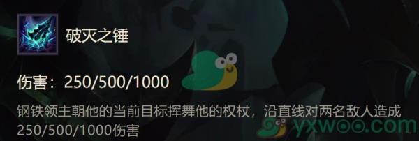 技能效果:钢铁领主朝目标挥舞他的权杖,1星时、2星时、3星时沿直线对两名敌人分别造成250、500、1000伤害
