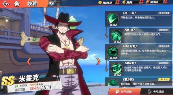 米霍克:有着“世界第一大剑豪”之称的鹰眼米霍克,在航海王热血航线中作为第一个限定SS级伙伴登场,米霍克在PVE中的表现极为突出,而在PVP竞技场中米霍克依然是极为强势的存在,在竞技场的属性平衡之后,米霍克的伤害依然离谱,打满一套就半血,这伤害就看不懂,加上其技能范围极广,普攻范围大,现在我打竞技场都把米霍克禁掉。