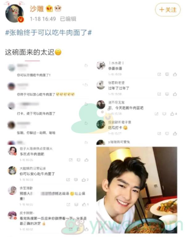 网友对曾经和郑爽在一起的张翰多了一分爱意,认为张翰和郑爽分手是对的。这碗牛肉面可以吃的越多越好。没人会再骂他了。