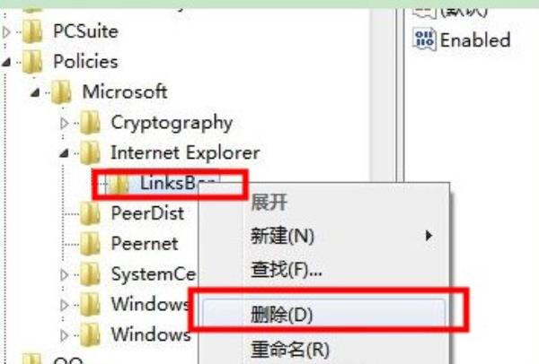 3、然后在【Internet Explorer】选项中找到【LinksBar】选项,右击选择【删除】