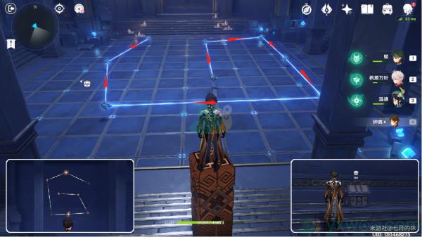 地上有连线图案,需要踩这4个压力板,改变星星的位置,使得天上的星像图和地上一样。(注意:每次进游或秘境,踩压力板移动星星的轨迹是不一样的,所以这里没有固定答案!)
