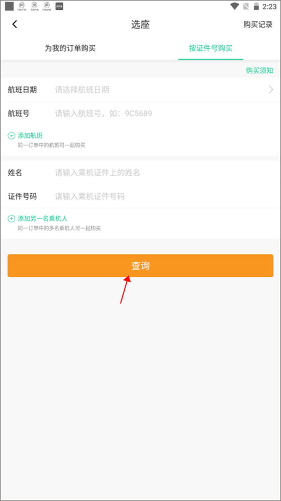 2、这时你还没有购买的机票订单,所以如果想选座的话可以按证件号查询机票订单,点击“按证件号购买”。