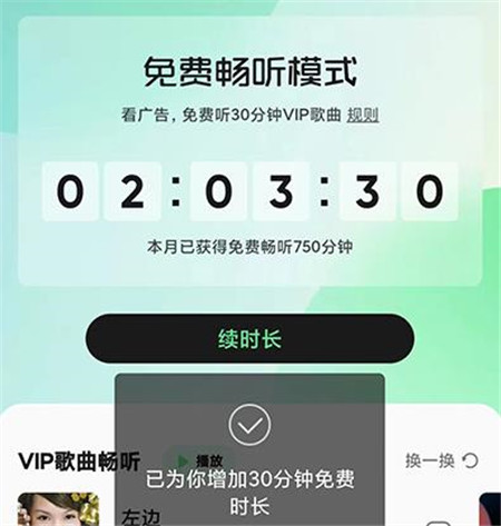5、关闭后就会显示已为你增加30分钟的免费时长,说明就可30分钟就可免费听vip的歌曲啦。